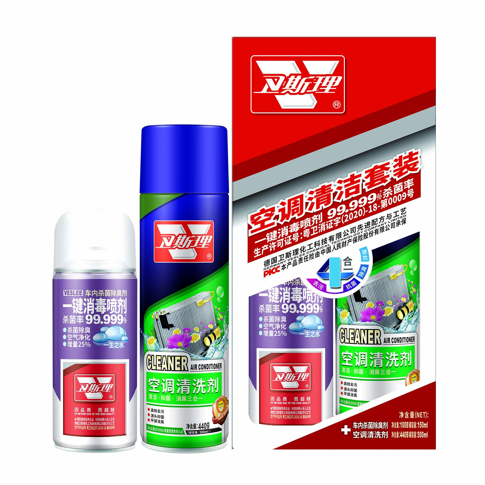 本套装内含车内杀菌除臭剂和空调清洗剂两款产品,由德国卫斯理化工科技有限公司提供配方和工艺,车内杀菌除臭剂专门针对车内细菌及异味的治理,高效杀灭车厢内日常使用所滋生的细菌,杀菌除臭双效合一,适用于车厢内空间及汽车空调。空调清洗剂采用国际先进旋转阀门和强力膨胀泡沫配方,能彻底清除附着在空调内部风扇、交换器和蒸发机上的灰尘、油污、虫迹和其他杂物防止在湿气的作用下,空调内部由污垢产生霉菌和细菌的繁殖;从而消除由细菌散发的臭气和霉味,并散发怡人的天然植物香味!清洁·抑菌·消臭三合一!是免拆汽车空调内部专业清洗剂。