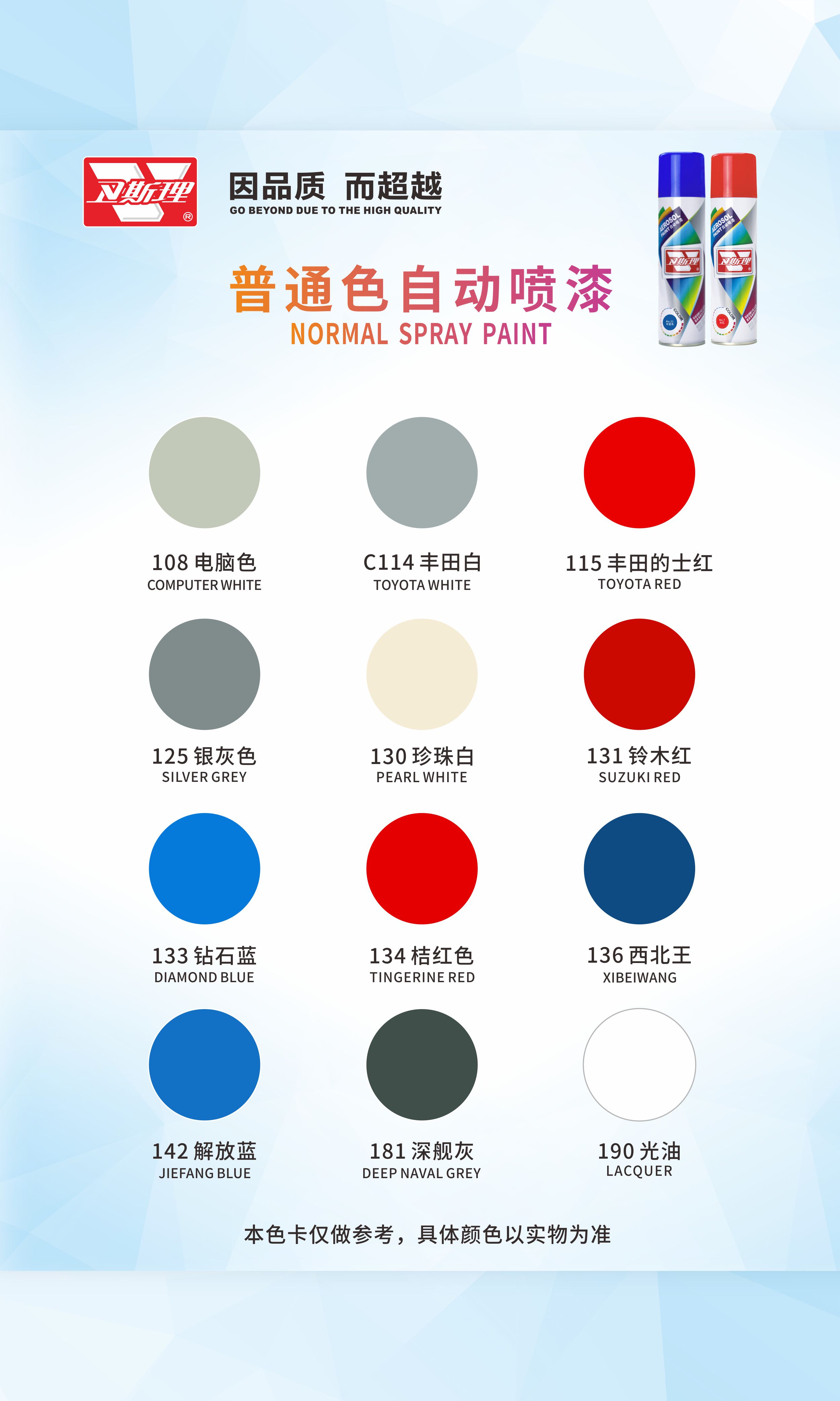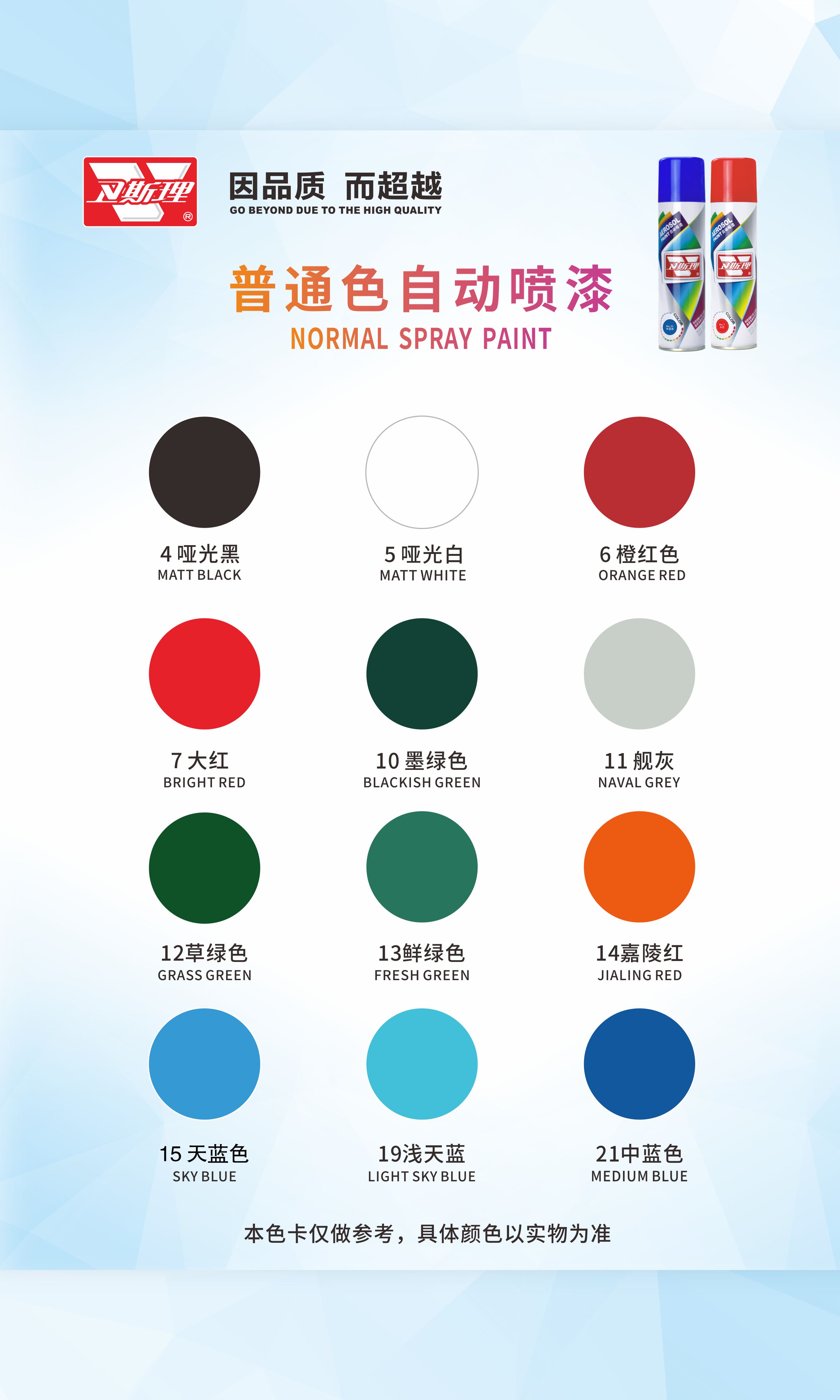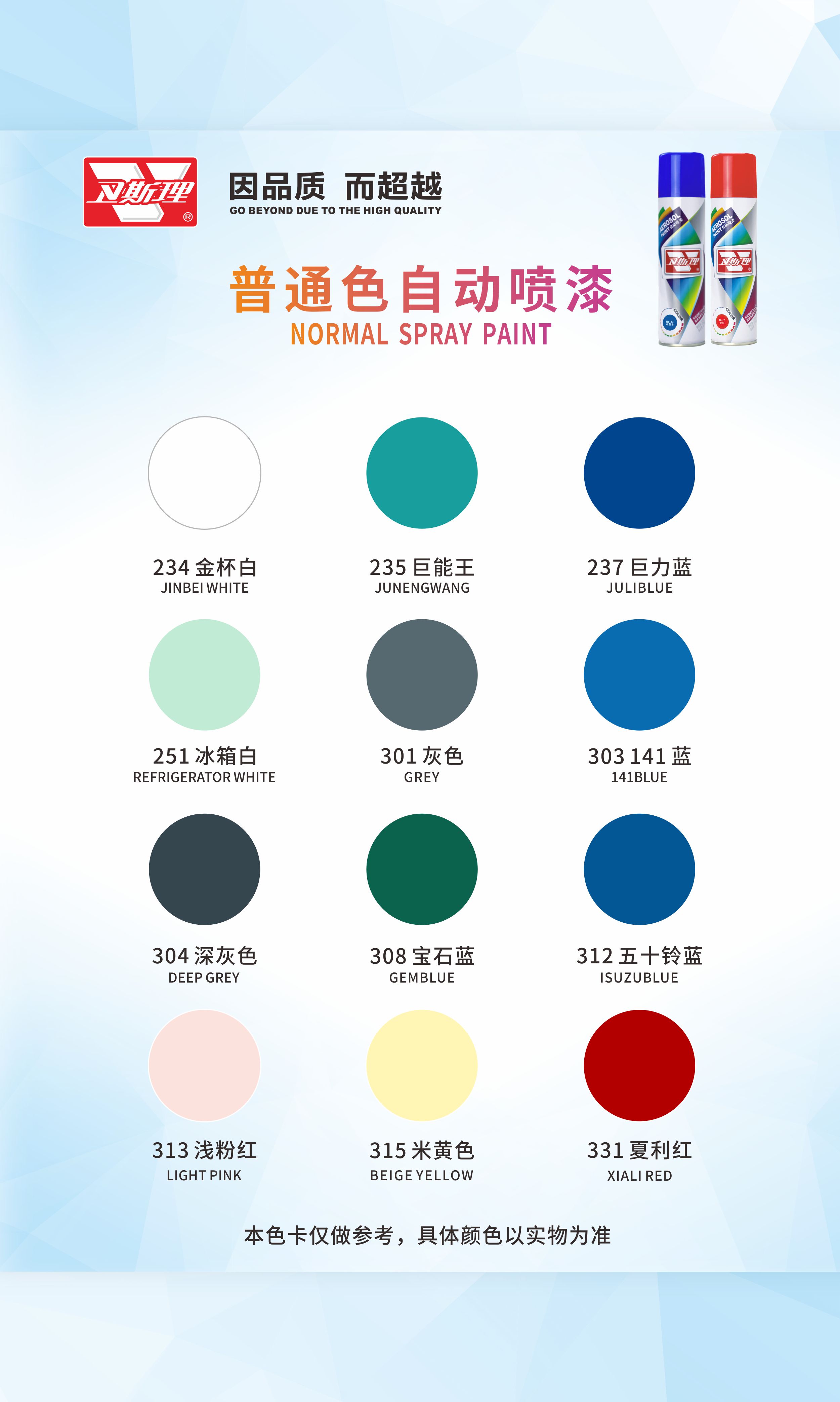 本品由德国卫斯理化工科技有限公司提供配方,采用国际先进制漆技术与原料精制而成。具有施工简便、雾化优、漆膜丰满,耐候性、硬度、柔韧性、耐冲击、附着力强,色泽持久不变等优秀性能。广泛应用于金属、木质、玻璃、皮制品陶瓷、ABS塑胶等多种材质物体的喷涂和修补。