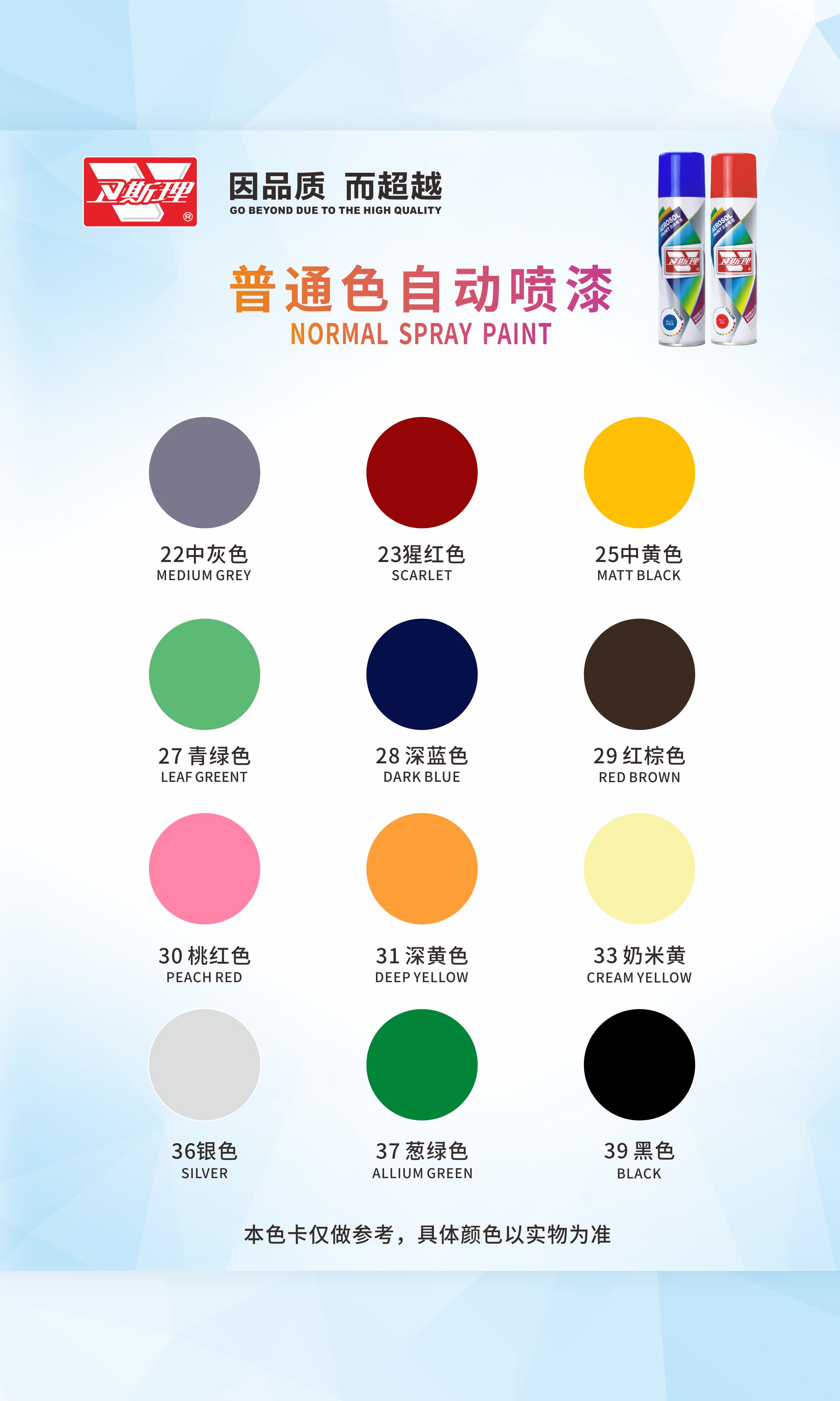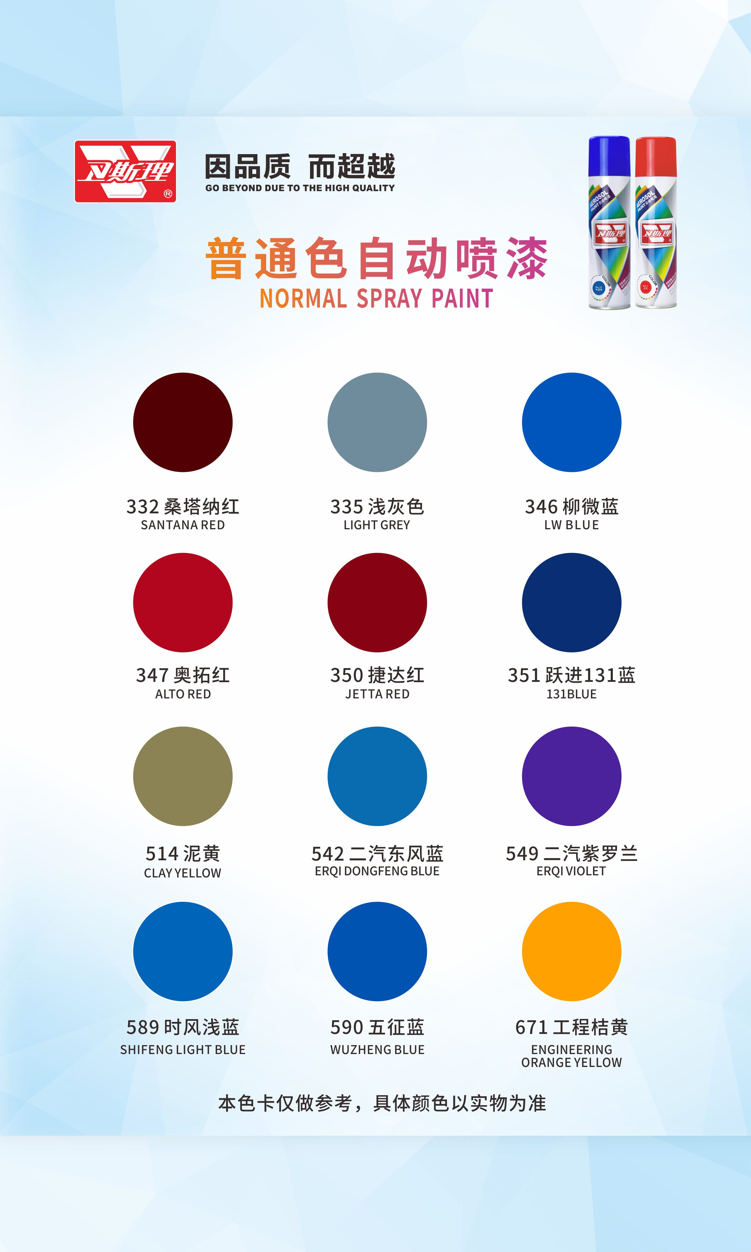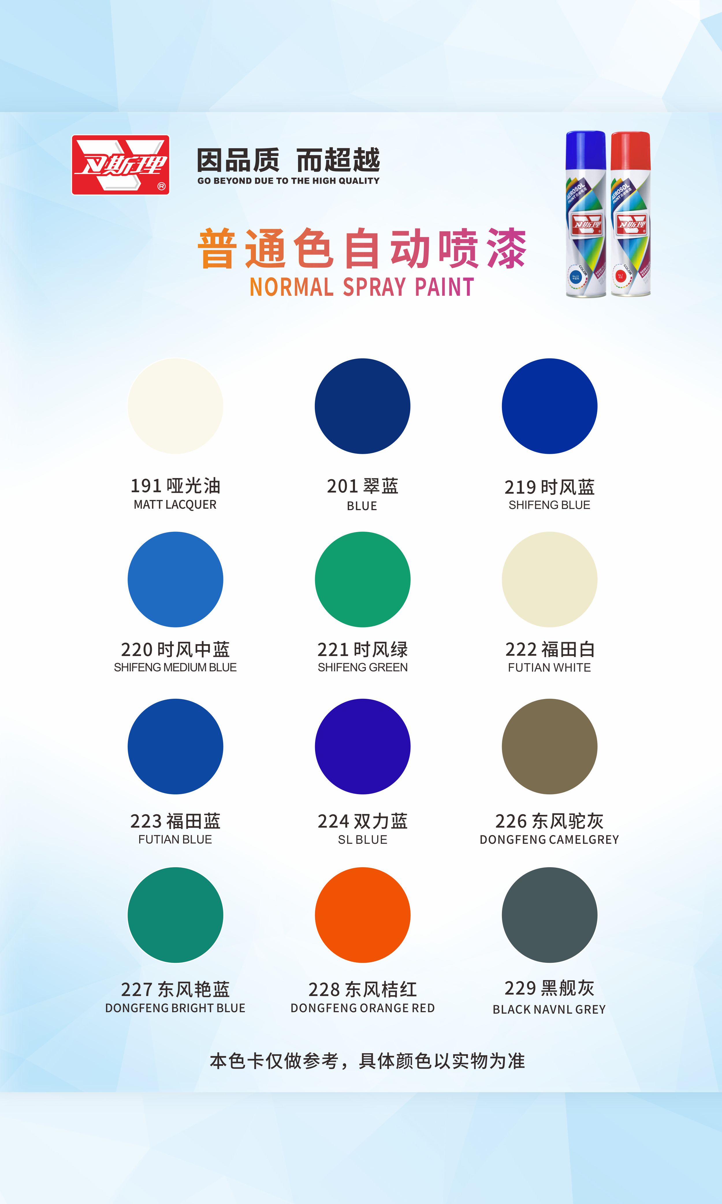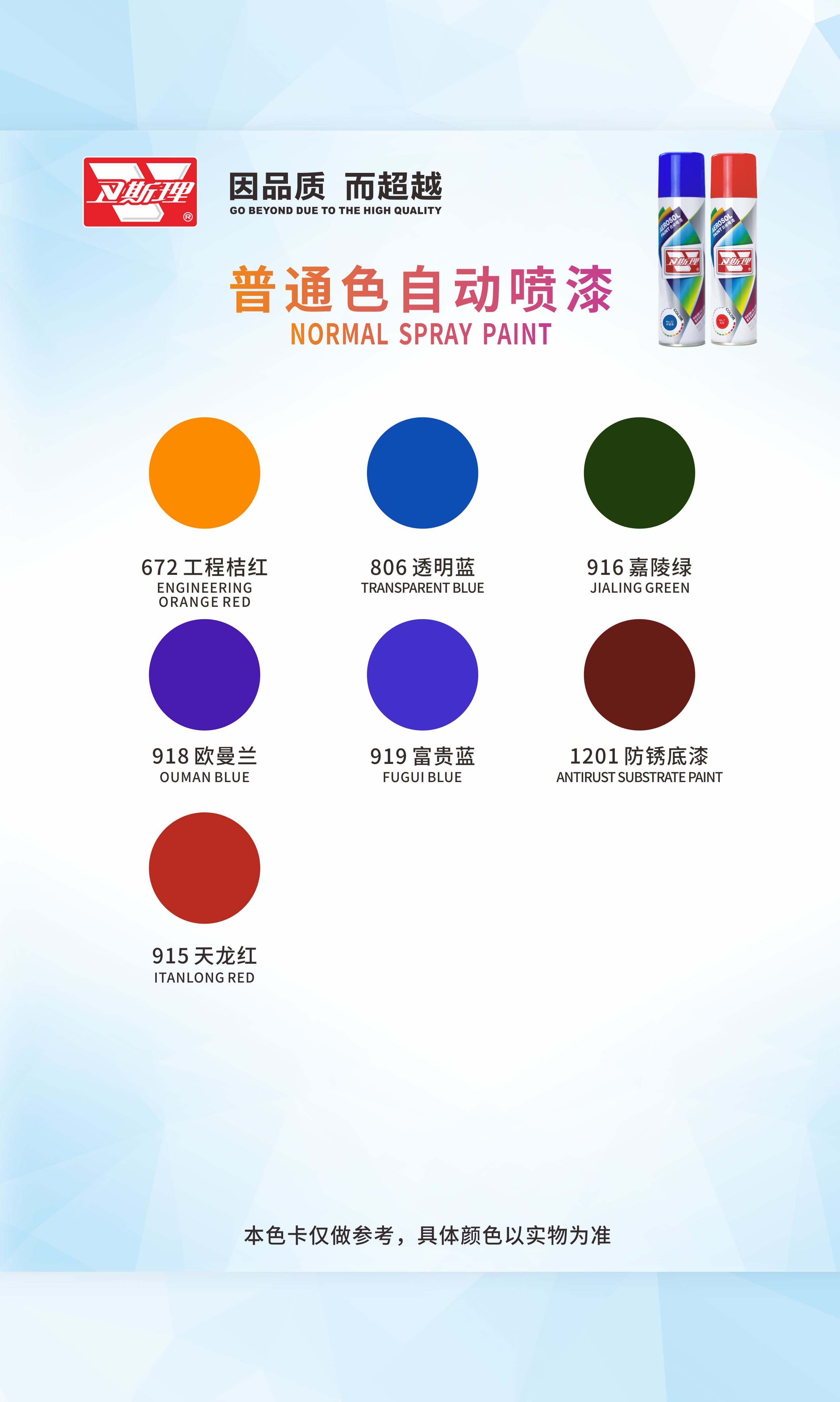 本品由德国卫斯理化工科技有限公司提供配方,采用国际先进制漆技术与原料精制而成。具有施工简便、雾化优、漆膜丰满,耐候性、硬度、柔韧性、耐冲击、附着力强,色泽持久不变等优秀性能。广泛应用于金属、木质、玻璃、皮制品陶瓷、ABS塑胶等多种材质物体的喷涂和修补。