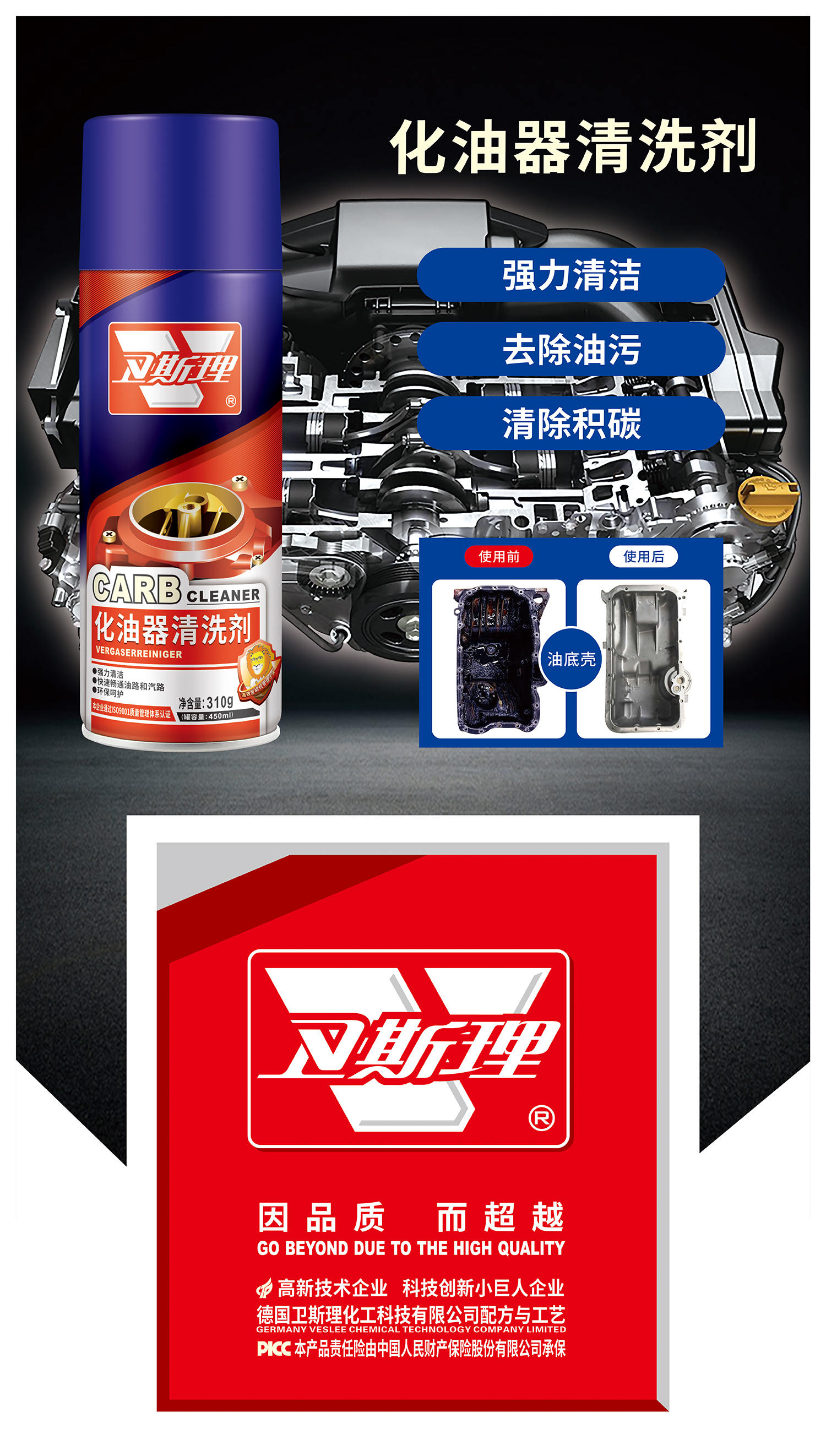本品由德国卫斯理化工科技有限公司提供配方和工艺,采用国际优质原料精制而成;能快速清除化油器、阻风门]、电子喷射系统及各种机械零件的胶质、油渍、污垢及氧化沉积物。恢复最佳状态和效率,延长机械部件的使用寿命。本品无损氧份敏感器元件。
