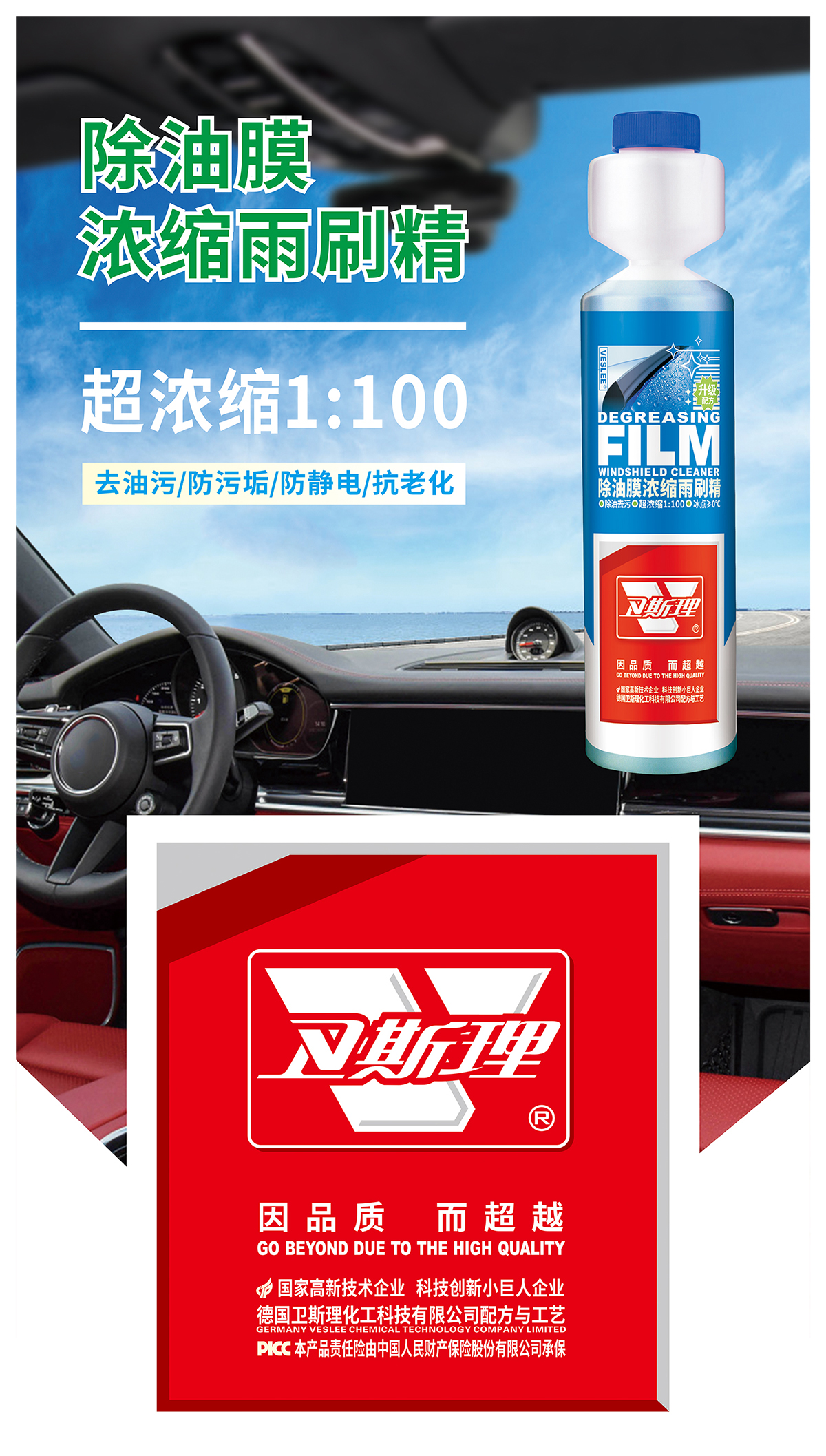 本品由德国卫斯理化工科技有限公司提供配方和工艺标准精制而成,其超浓缩配方能彻底清除挡风玻璃上的油膜、污垢、粉尘、昆虫和枝叶,润滑雨刷,降低雨刷与档风玻璃间的摩擦,延长雨刷使用寿命;本品不含甲醛,Ph值为中性,环保不伤玻璃,清洁后不留彩痕和水痕。