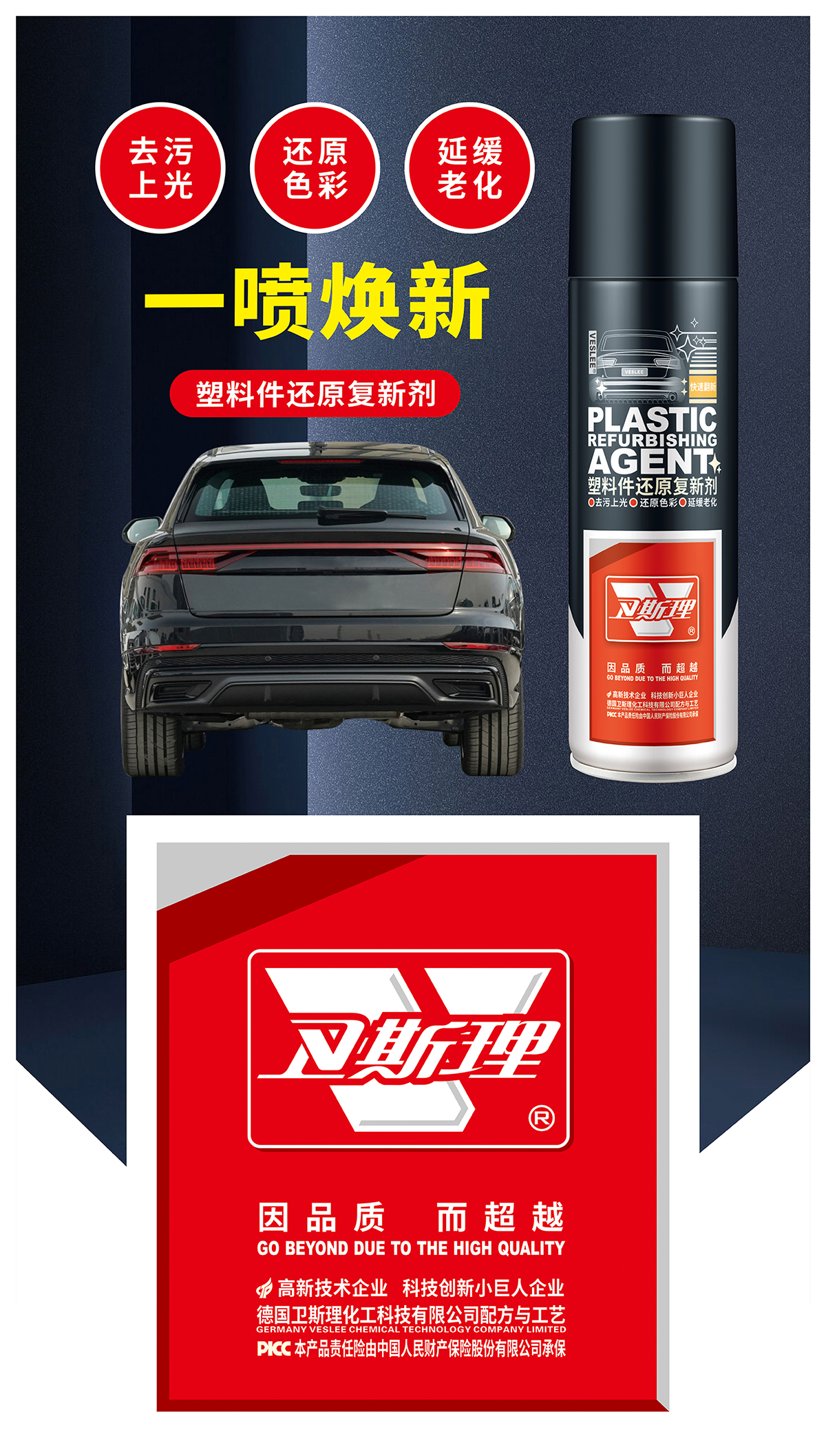 效还原色彩,迅速恢复新车塑料件乌黑光泽,并兼有去除塑料表面污垢和老